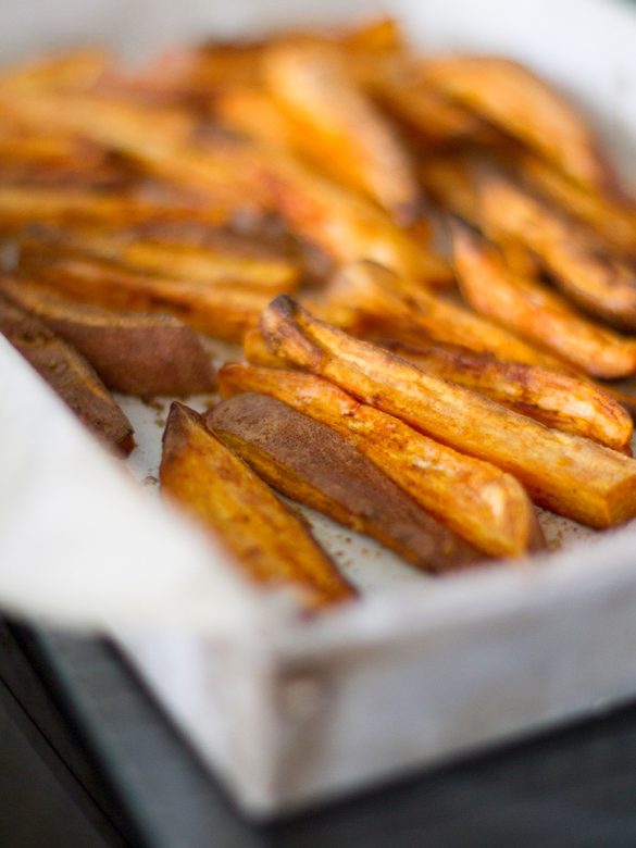 - Temperar com um fio de azeite, pimentão doce e sal. Muito importante: espalhar as batatas num tabuleiro, sem amontoar