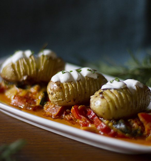 Estas batatas podem servir de acompanhamento a muitos pratos e ficam especialmente bem nos que têm molho, como um bom ragu (vejam a nossa receita aqui). Neste caso, foram as acompanhantes perfeitas para este salteado de vegetais que em breve terá receita no nosso blog. Também vivem bem sozinhas ou numa mesa de uma festa. É uma receita livre e tão versátil como a nossa imaginação.