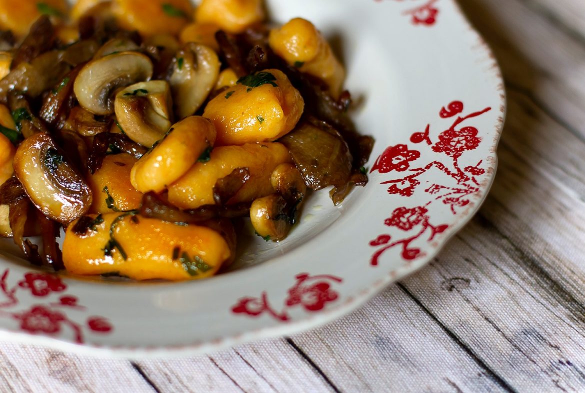 O título desta receita deveria ser “Gnocchi com batata doce e mistura de cogumelos”, mas isso iria parecer um daqueles pratos muito requintados. Gnocchi são simples almofadas de batata e não merecem ser tratados com muitos nomes.