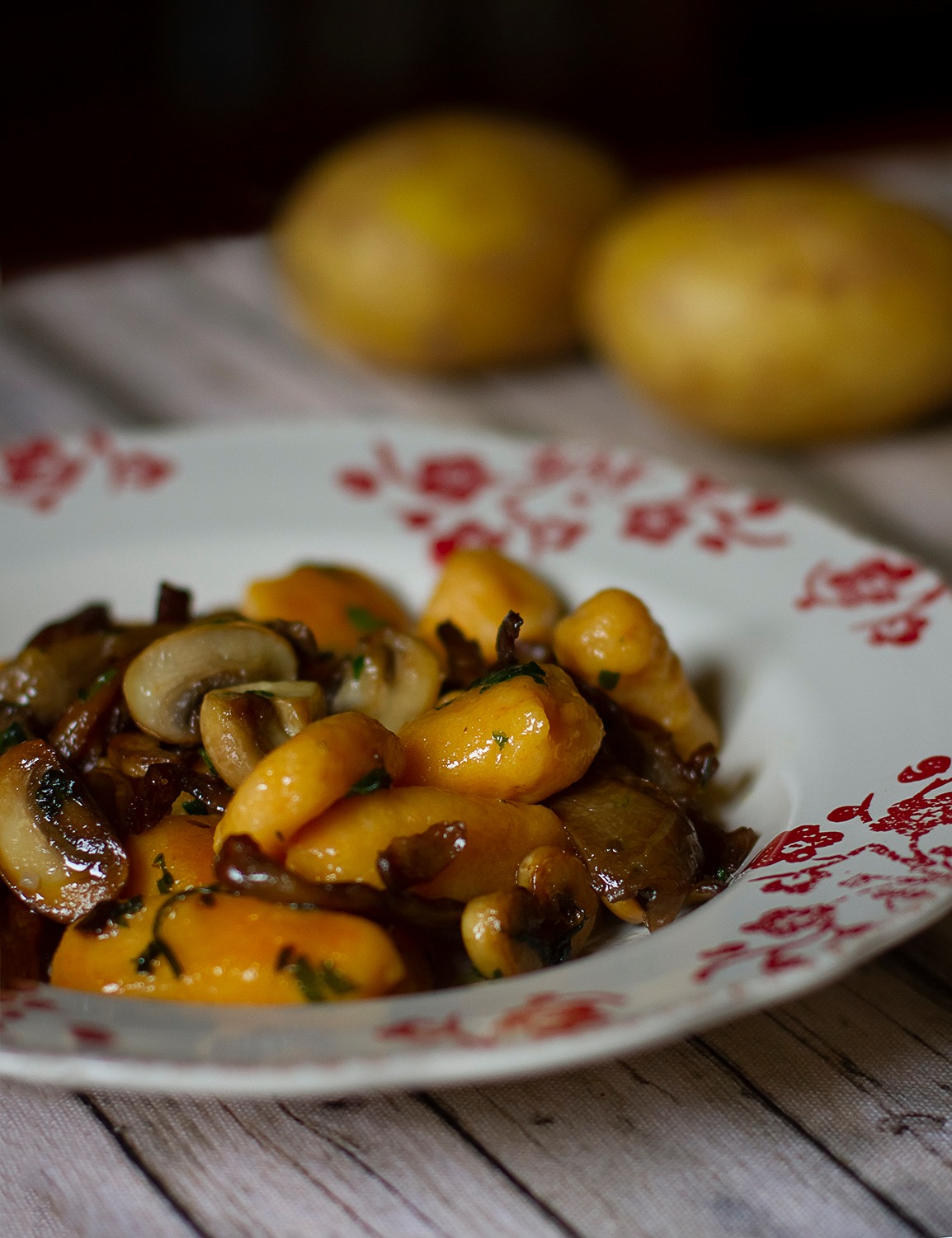 Estou-me a sentir muito mal por ter escrito tantos passos numa receita tão fácil e que não tem muito que saber. É só ter batata e fazer em puré, juntar farinha e ovo e moldar. Depois saltear uns cogumelos…como é que fui falar tanto nisto? É um dos grandes milagres da multiplicação, tal como os gnocchi, que com 3 ou 4 batatas se faz uma carrada deles.