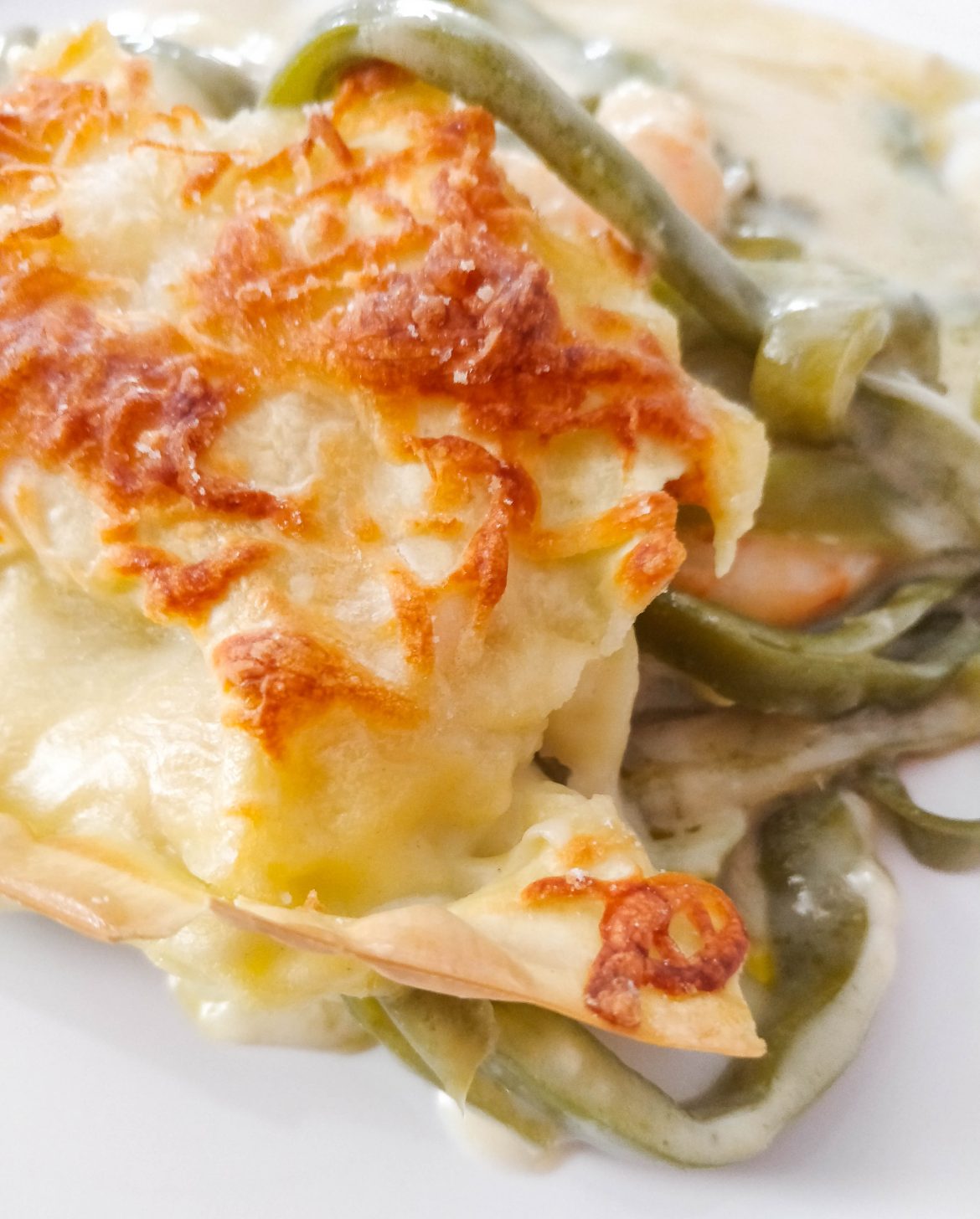 Se há prato saboroso e que nunca desilude é uma boa lasanha. Claro que quando falamos de lasanha, imaginamos logo camadas de massa com molho de tomate a escorrer, com as bolinhas de carne picada, tudo a nadar em béchamel. Béchamel este que não me venham com tretas de comprar feito no supermercado. Dá o seu trabalho, mas se vamos embarcar na empreitada de fazer uma lasanha, então façamos como deve ser. Assumindo a verdade (que eu não estou aqui para enganar ninguém) esta lasanha de camarão e feijão verde tem alguns quês de trabalho: desde descascar e arranjar os camarões, até à maior seca do universo que é arranjar feijão verde. Mas compensa, as fotos não enganam.