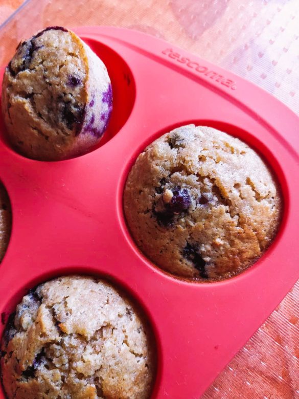 Ora, já sei que há formas de tornar estes muffins mais saudáveis: sim, pode-se substituir a manteiga por óleo de côco; sim, pode-se substituir o açúcar por um outro adoçante natural, como mel; e sim, pode-se substituir o leite magro por uma bebida vegetal à escolha. Mais ainda, não se esqueçam que estes muffins são ótimos para congelar e ir descongelando conforme for preciso. Reparem também naquele muffin maroto já a saltar da forma da Tescoma, de tão anti-aderente que ela é!