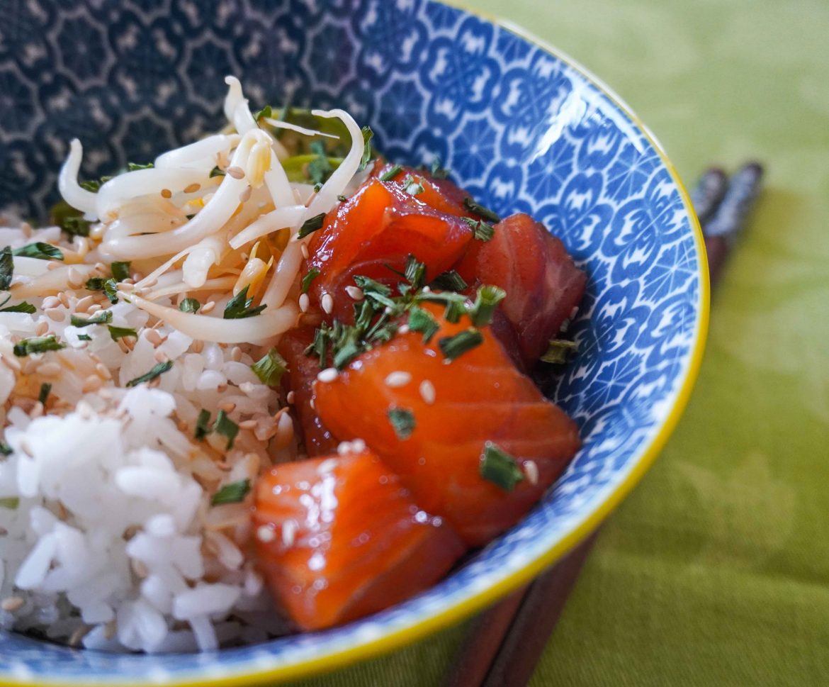 - Preparar o peixe: utilizar 1 lombo de salmão por pessoa, sem pele e sem espinhas, e cortar em pequenos cubos. Numa taça, juntar ¼ de chávena de molho de soja, 4 colheres de chá de açúcar mascavado, 1 colher de chá de vinagre de arroz, 1½ colher de chá de óleo de sésamo e 2½ colheres de chá de mirin. Juntar o peixe ao molho e deixar a marinar, no frigorífico, por 30 minutos.