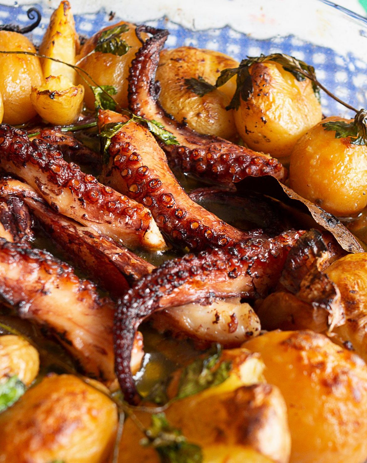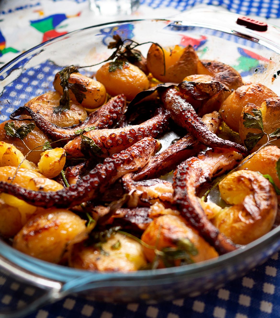 Polvo assado é um prato para dias especiais. Demora o seu tempo, precisa de cuidados e precisa de estar bem cozinhado. Não há nada pior em todo o mundo do que ter uma bonita travessa de comida e depois acabar a mascar molusco. O segredo é ter calma. Se ajudar, podem sempre espancar qualquer vegetal que tenham mais próximo e juntar ao prato.