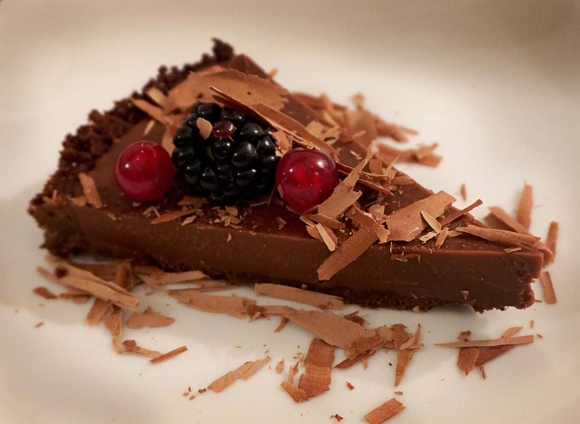 Não há muitos enterros tão festejados como os dos anos que passam. Quando enterramos os velhos anos, até podemos vestir roupas pretas, mas são brilhantes e cobertas de lantejoulas e, ao fundo, temos as cores do fogo de artifício. E a comida que pomos na mesa também deve combinar. Esta sobremesa é perfeita, porque é indulgente e podemos escolher entre comer uma fatia fina ou a tarte toda de uma vez, porque – acreditem – não vão enjoar.