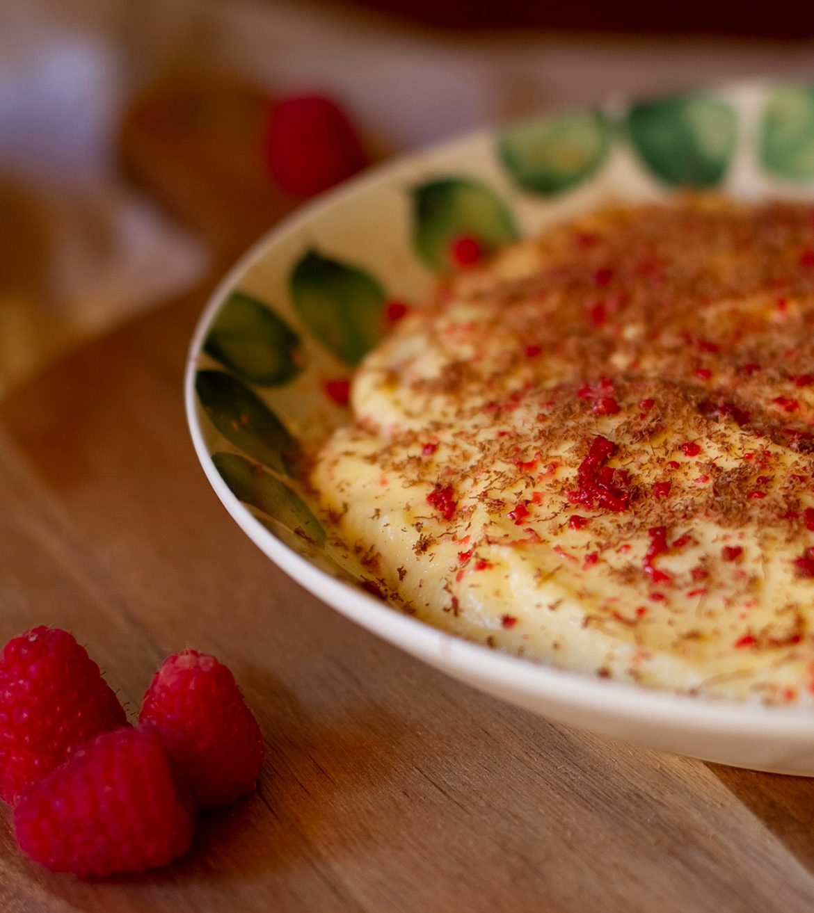 - Raspa-se chocolate preto e framboesas congeladas por cima e leva-se ao frigorífico pelo menos duas horas.